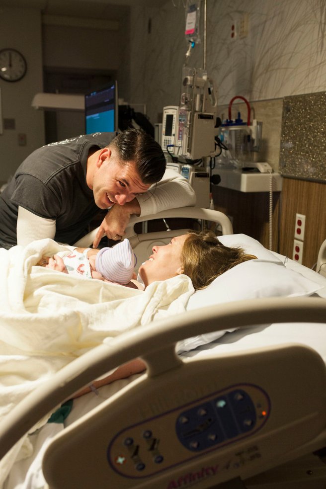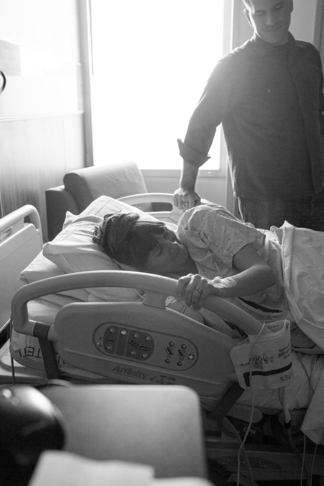 I leaned over to Mason and said, “This isn’t fun anymore” and he just laughed (nervously). All throughout my labor, I had to be on the monitor for 20 minutes every hour to make sure Ford was doing okay. As my contractions became more intense and painful, I tried to recall what I had learned in our birthing classes and started using different positions during contractions. Due to Ford’s position, I wasn’t able to use the birthing ball or sit forward onto the bed or table during contractions because his heart rate would go down. I was pretty much limited to standing, sitting in a relaxed position or lying in the bed.