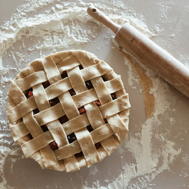 - At this point, you should have one half of the pie crust dough in the pie dish and one half in the bowl, still unrolled. Take the other half of the dough and roll out as you did before and then once it is roughly the size of the pie dish, or a bit bigger, you will begin to cut your lattice pieces. Here is a great tutorial on how to make the lattice top. It’s really not too difficult, especially for how amazing the pie looks when it is done!