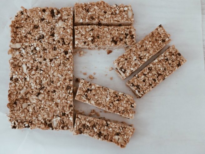 Place in the freezer for 45min to an hour, or until it is firm. Lift the parchment paper out of the pan with the granola. Cut the big square in half, then cut each half into 6 rectangles.