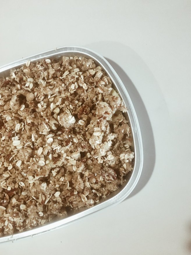 In a food processor fitted with the steel blade, pulse the flour, brown sugar, 1/4 cup of granulated sugar, and the salt until combined. (I used a 1:1 gluten free flour and it worked great!) Add the butter and pulse until the mixture resembles coarse meal. (Alternatively, the flour, sugar, and salt mixture can be mixed by hand, and the butter can be “cut in” with a pastry cutter, two knives, or your fingers.) Transfer mixture to a medium bow and stir in the pecans and oats (I also used gluten free oats here.) Set aside.